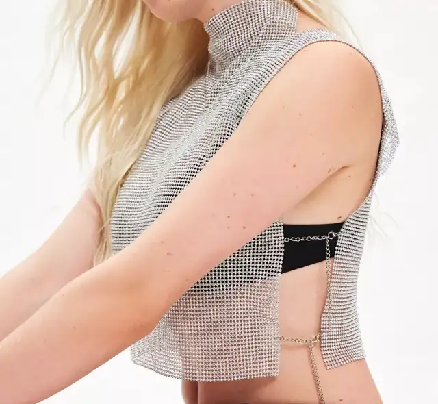 For those who love to make a statement, this metallic chainmail tank top is a dream come true. The semi-sheer fabric and high mock neck create a look that’s edgy and unforgettable.