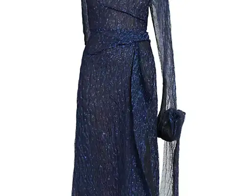 For those with a love of theatrical fashion, the Metallic Draped Cape Midi-Dress by Erdem is a dream come true. Known for blending Victorian romance with modern design, Erdem has created a statement piece that feels both regal and fashion-forward. This sapphire-hued midi dress features a metallic textured finish with a semi-sheer look, and elongated cape sleeves that add a dramatic, ethereal effect.