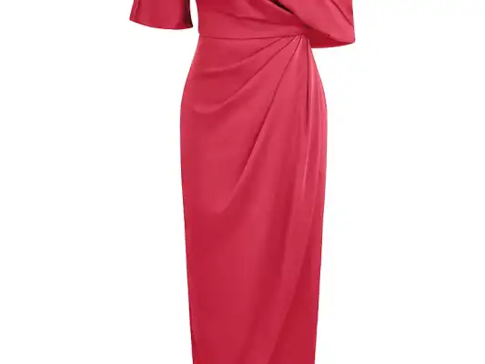For those who appreciate bold colors and flattering silhouettes, Theia’s Rayna One-Shoulder Gown in ruby is a statement piece that exudes confidence. Named after the Greek goddess of light, Theia’s designs focus on illuminating the wearer’s natural beauty, making this gown an ideal choice for special events or gala nights. With its asymmetric neckline and pleated wrap skirt, the Rayna gown brings both structure and movement to your look.